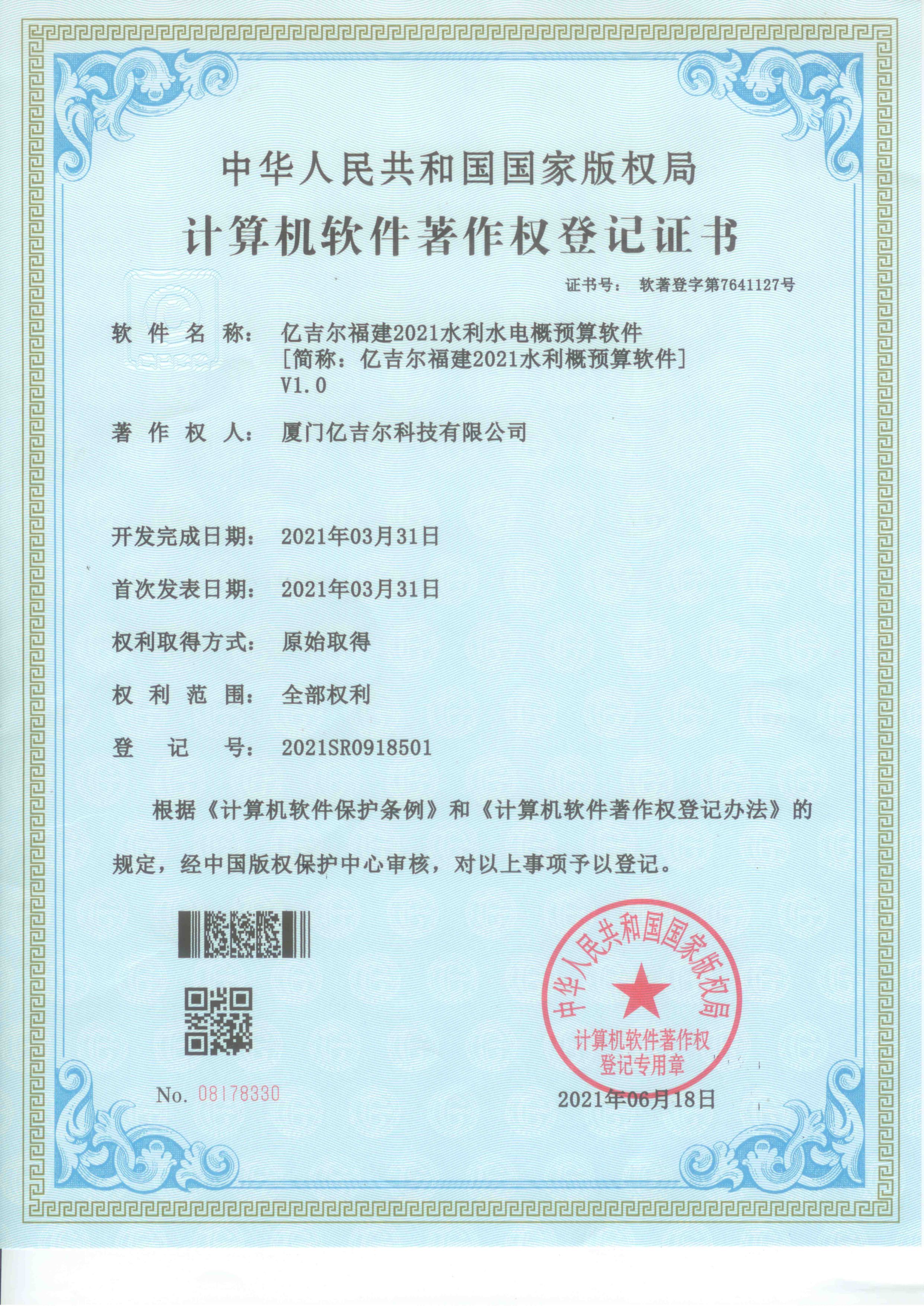 億吉爾福建2021水利水電概預(yù)算軟件著作權(quán)證書 發(fā)布日期:2023年11月22日 瀏覽次數(shù):2450 關(guān)鍵字: 公司 1/1億吉爾福建2021水利水電概預(yù)算軟件著作權(quán)證書