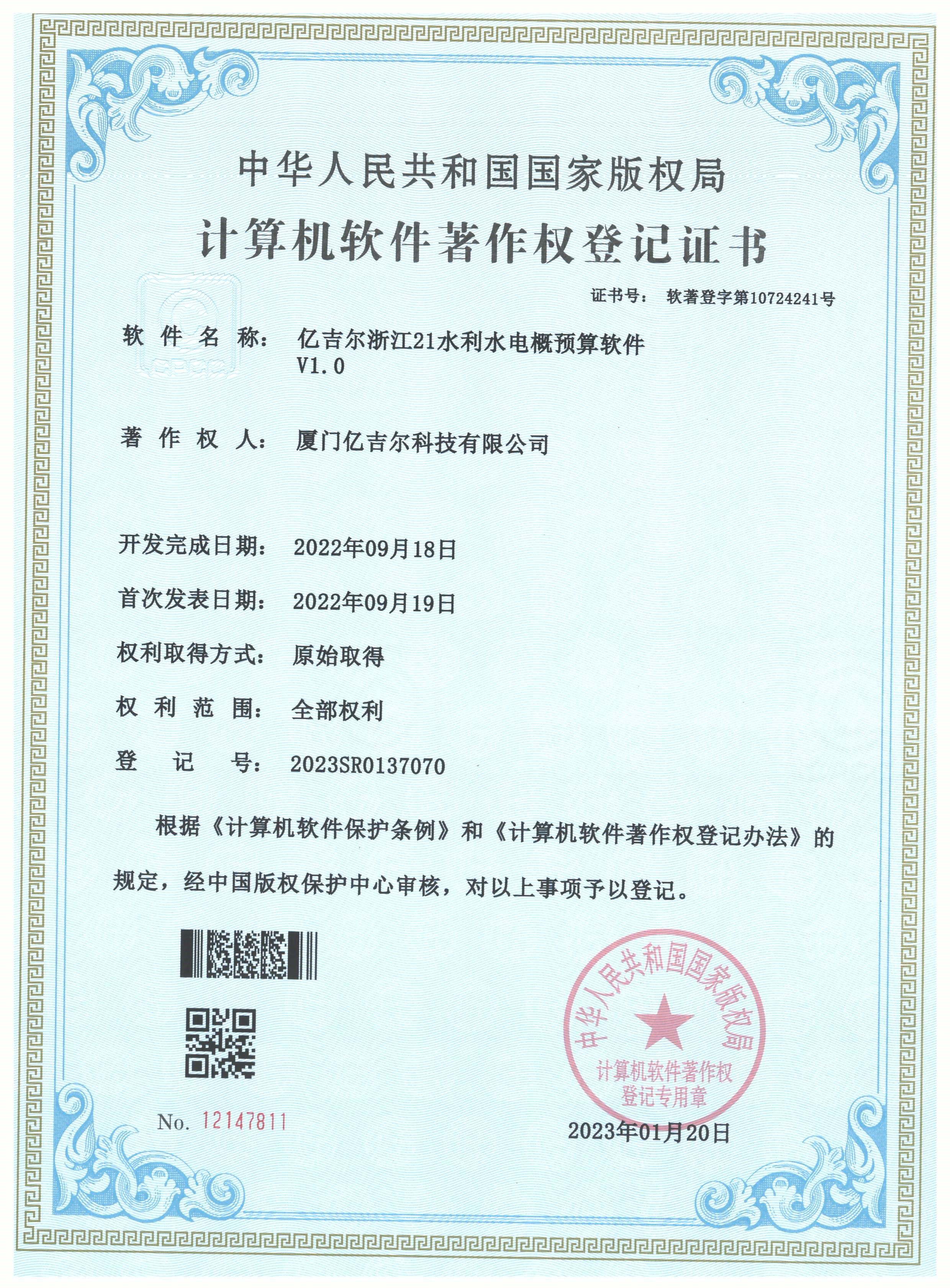 億吉爾浙江21水利水電概算軟件登記證書 發(fā)布日期:2023年11月22日 瀏覽次數(shù):2528 關(guān)鍵字: 公司 1/1億吉爾浙江21水利水電概算軟件登記證書(2022R11L1869444)