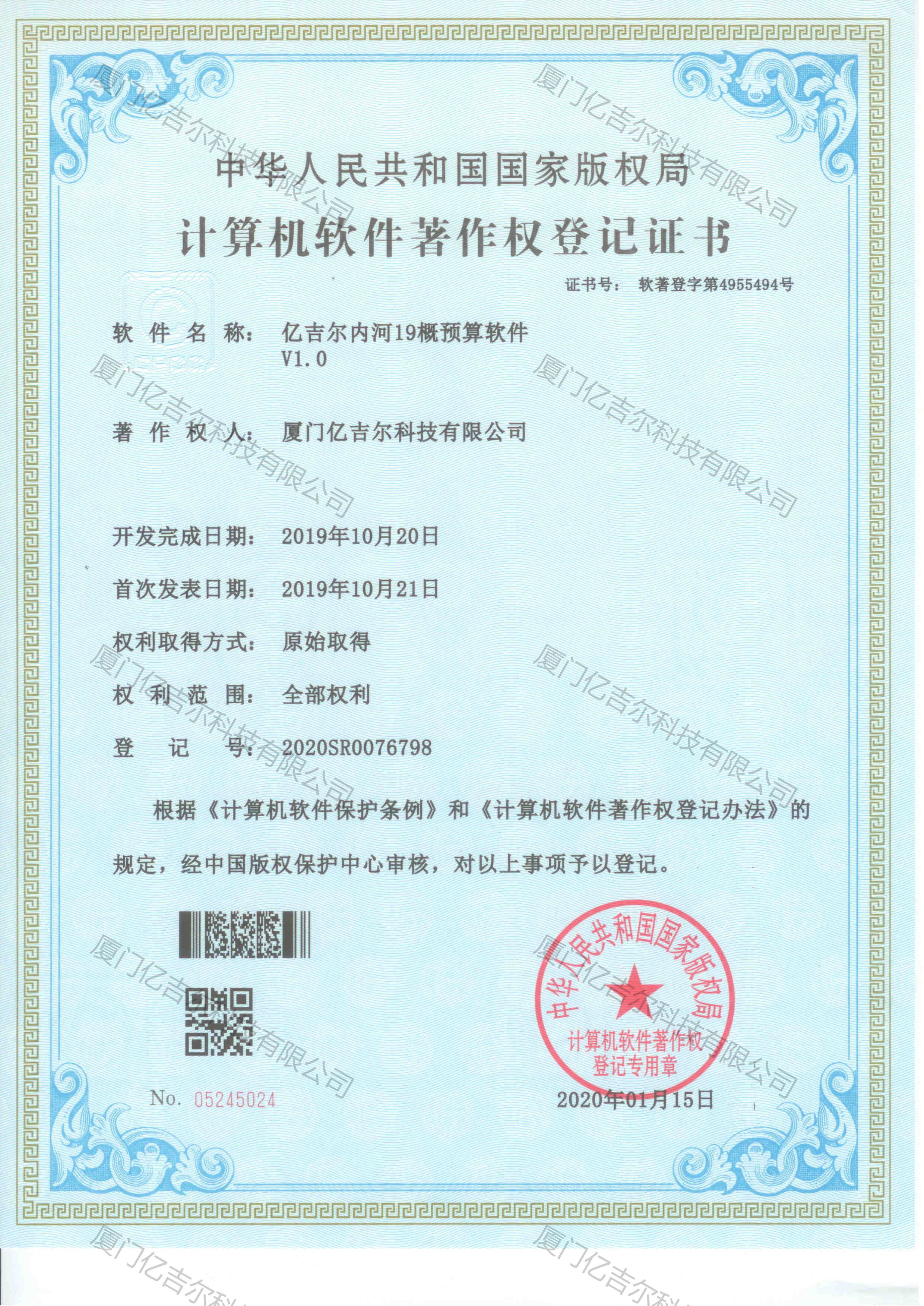 億吉爾內(nèi)河19概預(yù)算軟件著作權(quán)登記證書 發(fā)布日期:2020年01月15日 瀏覽次數(shù):4443 關(guān)鍵字: 公司 1/1億吉爾內(nèi)河19概預(yù)算軟件著作權(quán)登記證書