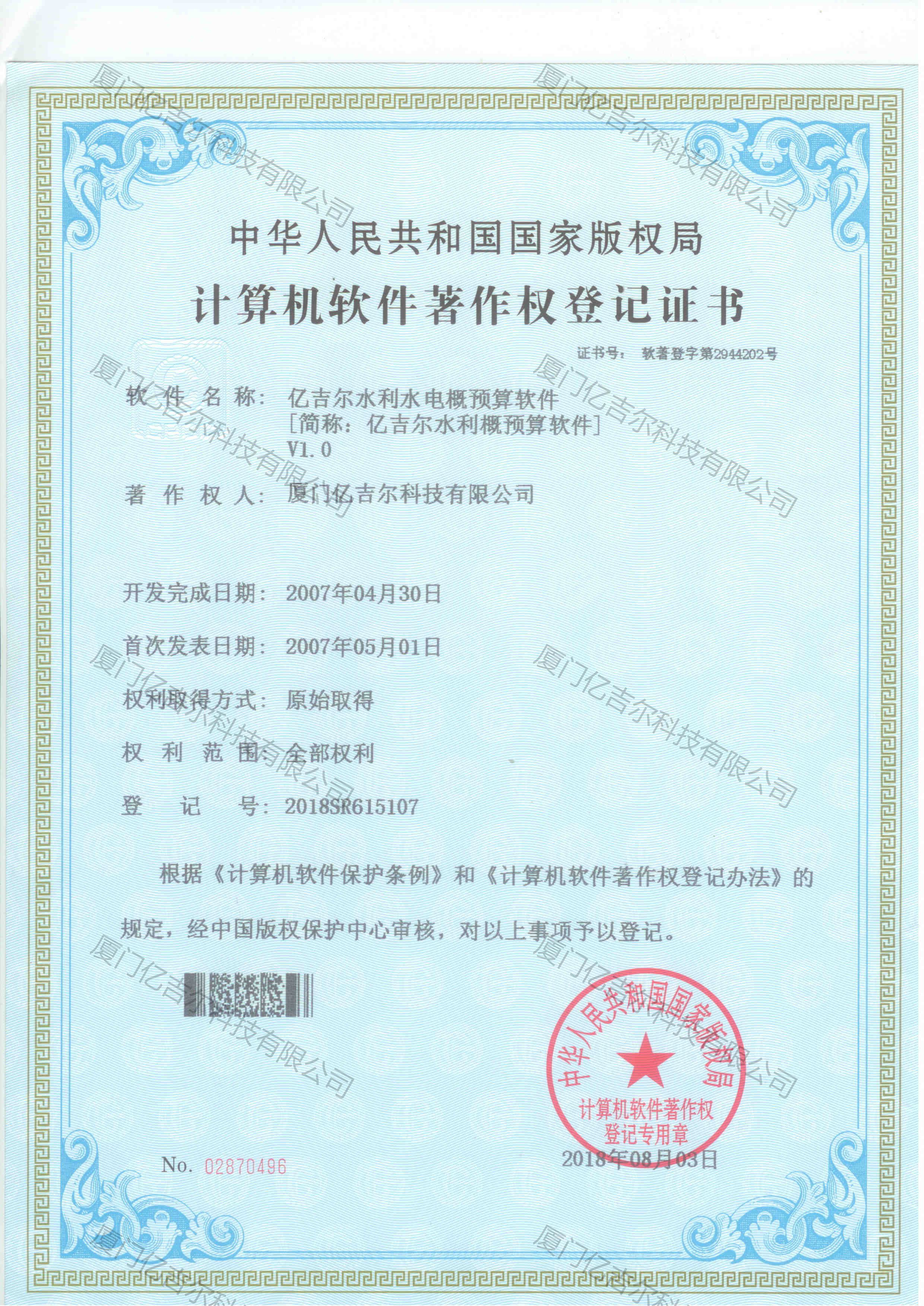 億吉爾水利水電概預(yù)算軟件著作權(quán)登記證書 發(fā)布日期:2018年08月03日 瀏覽次數(shù):3825 關(guān)鍵字: 公司 1/1億吉爾水利水電概預(yù)算軟件著作權(quán)登記證書