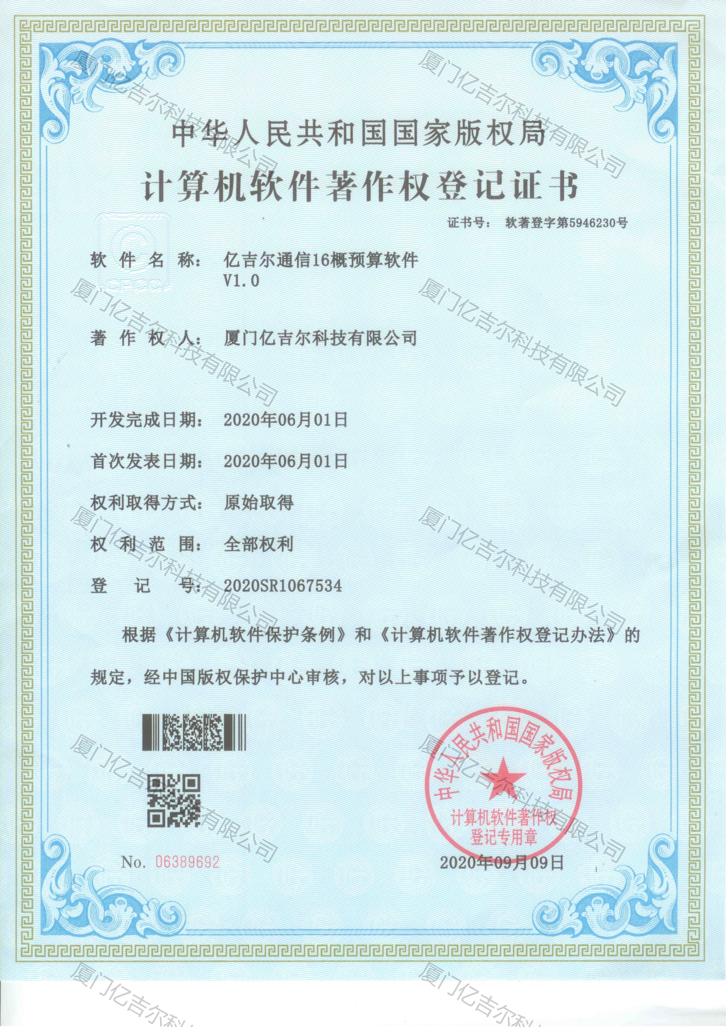 億吉爾通信16概預算軟件著作權(quán)登記證書 發(fā)布日期:2020年09月09日 瀏覽次數(shù):4327 關(guān)鍵字: 公司 1/1億吉爾通信16概預算軟件著作權(quán)登記證書