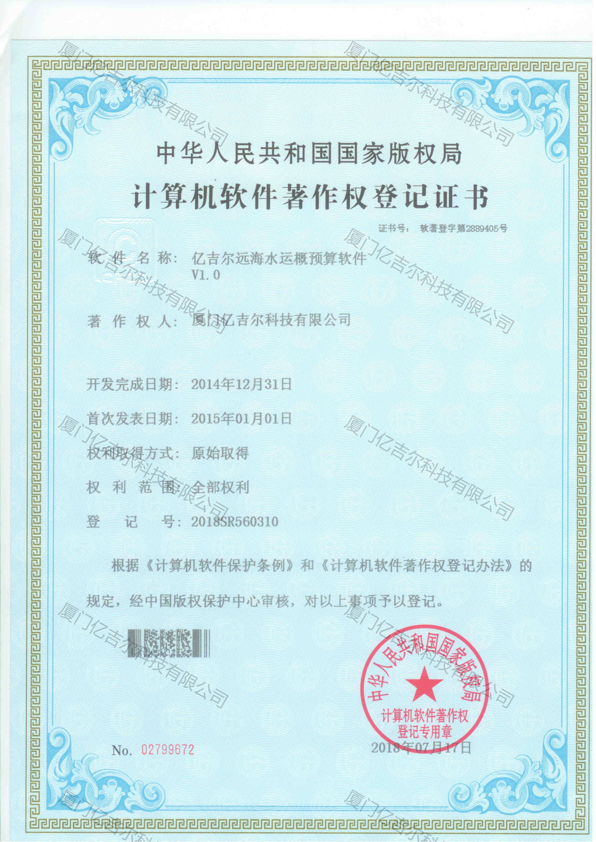 億吉爾遠(yuǎn)海水運概預(yù)算軟件著作權(quán)登記證書 發(fā)布日期:2018年07月17日 瀏覽次數(shù):3930 關(guān)鍵字: 公司 1/1億吉爾遠(yuǎn)海水運概預(yù)算軟件著作權(quán)登記證書